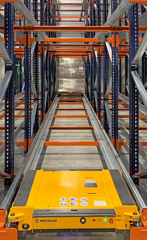 Mecalux a installé un bloc de rayonnages, de 29 m de long et de 8 m de haut, dotés du système Pallet Shuttle semi-automatique. La solution occupe seulement 350 m2, mais offre une capacité de 1 120 palettes.